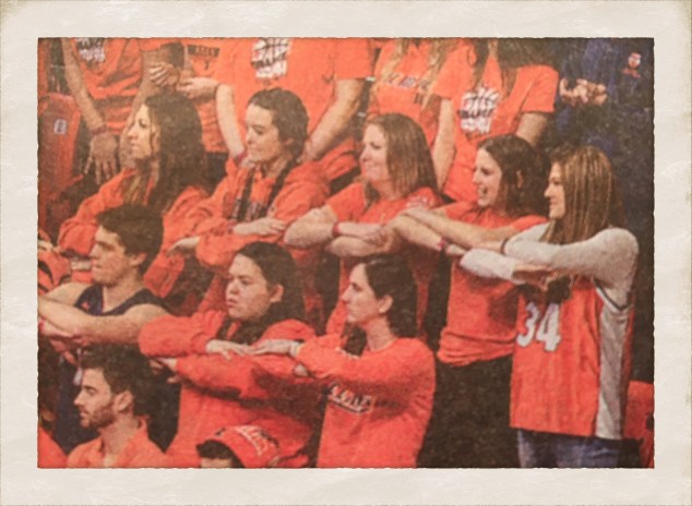 The image is of a group of young people, students, in an arena. They are decked out in Illinois orange and the great majority of them have their arms crossed. This, we will learn, is a “Chief Illiniwek pose,” the “Chief,” again, being the mascot (or “symbol,” depending on with whom one talks) of the University of Illinois from 1926-2007.