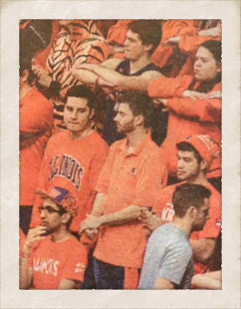 The photograph carried the following caption: “At Illinois’s late-February game versus Purdue U., basketball fans strike a Chief Illiniwek pose.”
