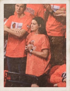 The two women in these images both suggest that they have less enthusiasm about adopting a “Chief Illiniwek” posture than their male companions. They don’t seem ready to buck the crowd by refusing the gesture, but neither do they fully embrace it. Their hands clasp at chest level, but their arms don’t cross. Is this a fair reading: “I not really comfortable about doing this ‘Indian’ thing, but maybe I won’t be noticed if I just kinda hold my hands together.” And what about the woman in the image below?