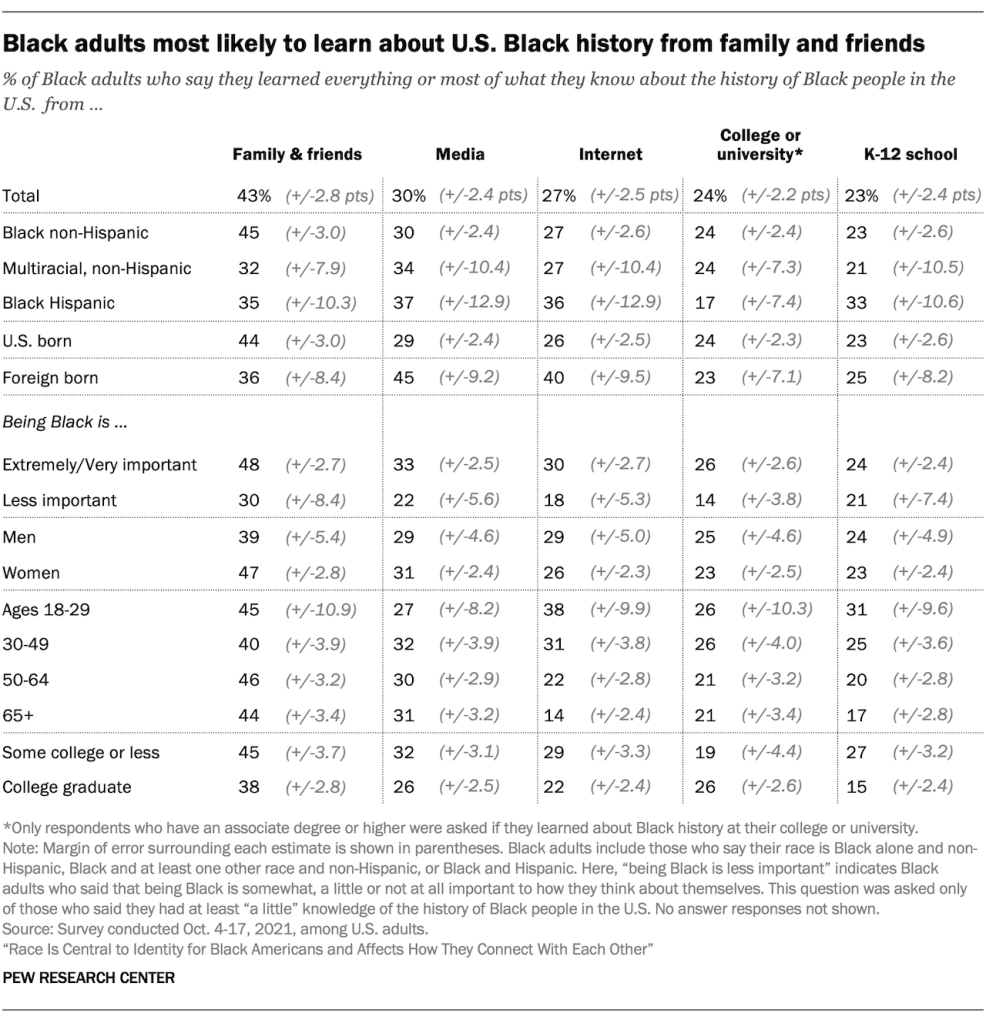 A recent report from UCLA Law found that lawmakers introduced 563 measures against the teaching of “critical race theory” in 2021 and 2022 (more followed this year), with 241 of them having been adopted. What does this mean? I hardly need to repeat what you certainly must be familiar with, but here’s North Dakota’s version: Racism, if discussed at all, must be understood as “the product of learned individual bias or prejudice.” Teachers are prohibited from arguing that it is “systemically embedded in American society and the American legal system to facilitate racial inequality.” Again, I don’t have to tell you the kind of damage these state laws create for teachers who are trying to teach U.S. history with the seriousness it requires, or to students who will be deprived of an honest reckoning with the country’s past or with their own histories. And it’s not as if these new laws will staunch a flourishing curriculum about the history of slavery or Black history in our nation’s schools or universities. According to a Pew Research Center Report for 2022, less than a quarter of Black adults reported learning about U.S. Black history from K-12 schools, colleges, or universities. Many more learn about it – about their own history – from family and friends.