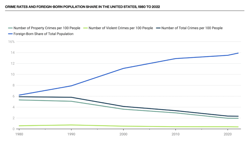 Whether immigrant or native-born, we can agree that those who commit crimes should be prosecuted under the laws we have. And, with the highest incarceration rate of any independent democracy on earth, we’re pretty good at that. But contrary to what Trump’s supporters think, violent crime has reached close to a 50-year low at precisely the same time that immigration has hit its highest level in decades. In 1980, immigrants made up 6.2% of the U.S.; by 2022 immigrants accounted for almost 14% of the population, and yet, the crime rate dropped by more than 60% over the same period.