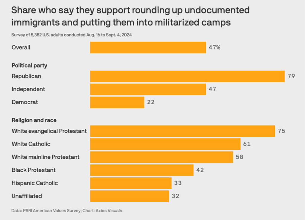 Equally troubling for the state of American democracy are the results of another recent poll indicating that nearly 80% of Republicans and half the US population supported the proposition that “undocumented immigrants should be rounded up and put into militarized camps.”