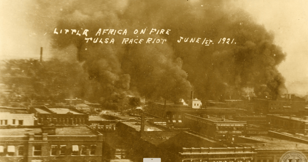 I don’t have to remind you that we recently marked the centennial of the race massacre that led to the destruction of the so-called “Black Wall Street,” the prosperous 35-block Greenwood neighborhood in Tulsa, Oklahoma. On May 31 and June 1, 1921, a white mob of thousands, aided and abetted by the police and the National Guard, rampaged through Greenwood, leaving behind a heap of rubble where once a thriving town had stood, up to 300 dead (we’ll never know the exact count as Black lives didn’t matter), a thousand injured, and some 6,000 Black townsfolk penned up in the fairgrounds and other large sites. Nearly 10,000 people were left homeless as 1,256 homes were looted and burned down.
